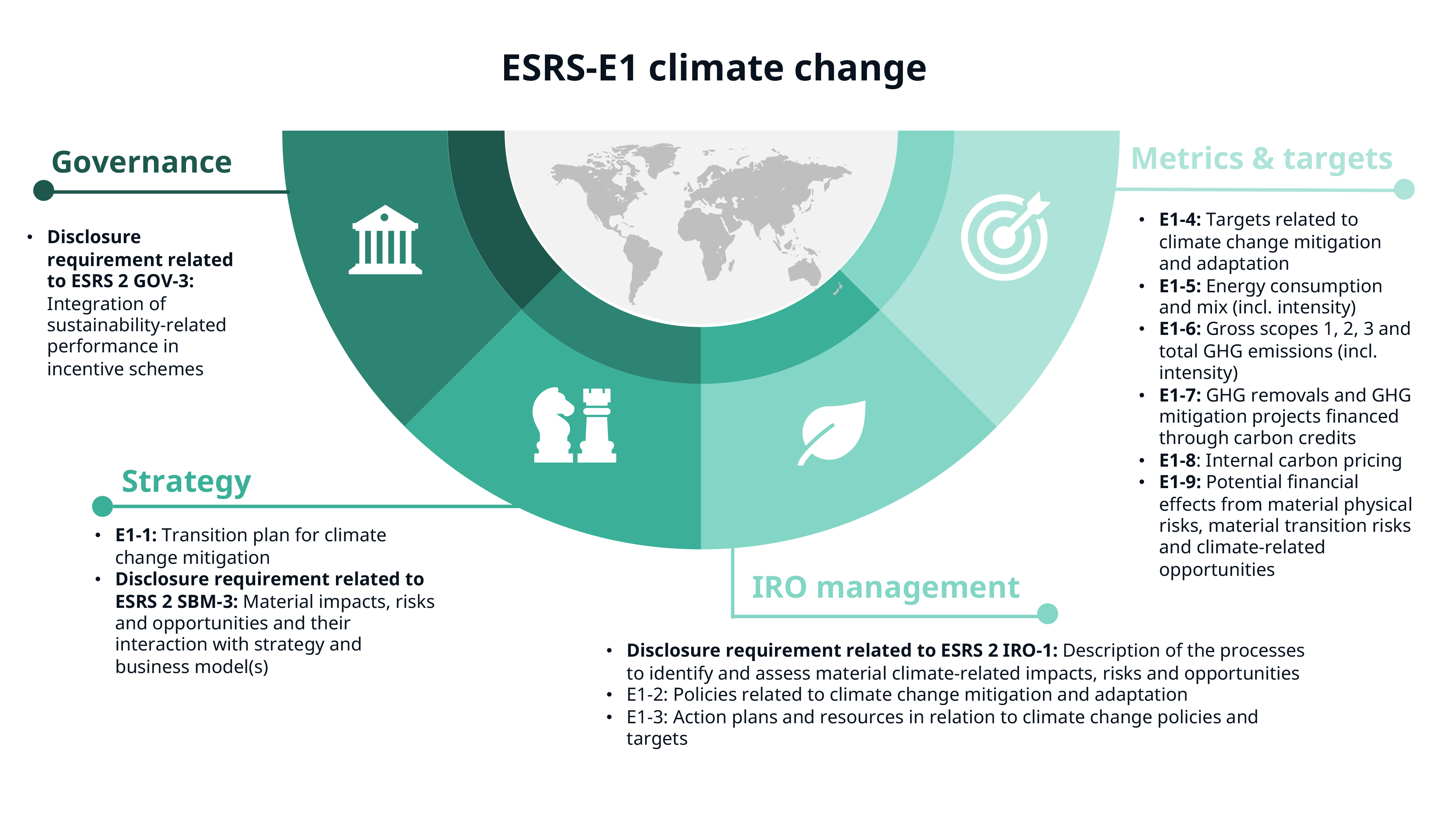 L’Accord de Paris, un traité international historique, vise à limiter le réchauffement climatique bien en dessous de 2°C, avec l’ambition de le maintenir à 1,5°C. La norme ESRS E1 met l’accent sur l’alignement des objectifs de durabilité des entreprises sur ces objectifs. Il ne s’agit pas seulement de reconnaître l’Accord, mais aussi d’illustrer la manière dont votre entreprise contribue activement à la réalisation de ses objectifs.